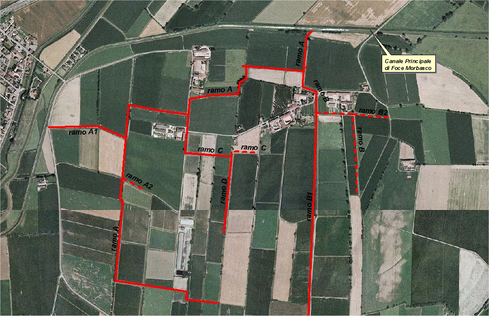 La rete è praticamente resa inutilizzabile dalle continue rotture del vecchio rivestimento o dai buchi nel terreno realizzati dagli animali. Il terreno piuttosto sabbioso non pone resistenza alla spinta dell'acqua, è pertanto necessario rifare completamente la rete e come detto, vista la natura del terreno piuttosto sabbioso si presta in particolare alla esecuzione mediante la posa di tubi in sotterraneo.